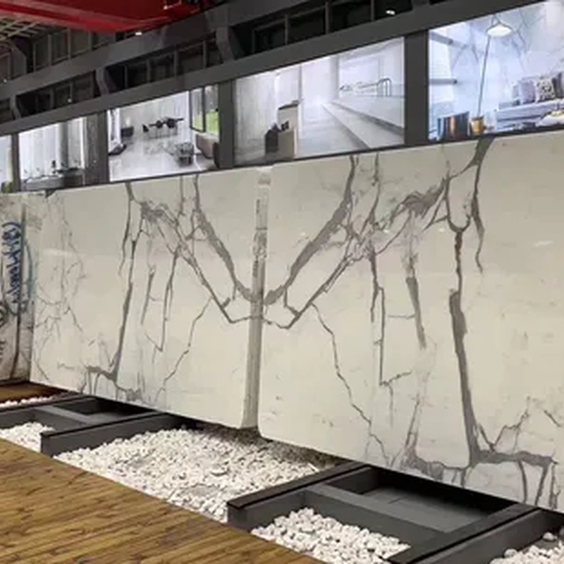 Premium Natural Calacatta Marble: We source authentic Calacatta marble directly from our factory, featuring stunning white backgrounds with elegant grey veining that brings timeless luxury to your villa floors, walls, and countertops at competitive wholesale prices.
