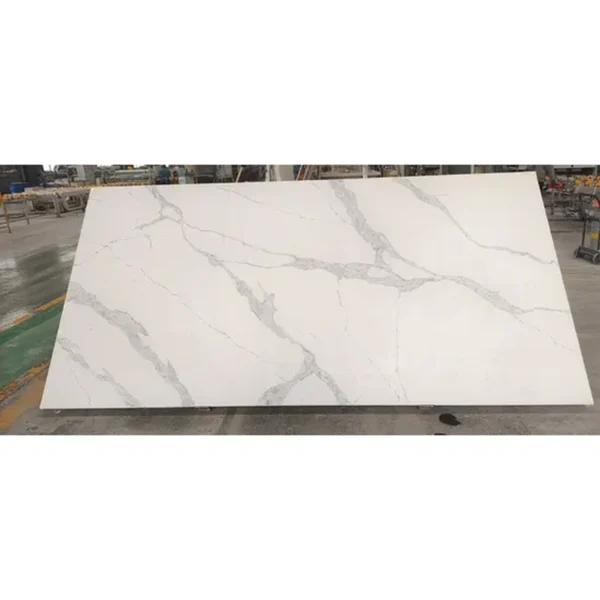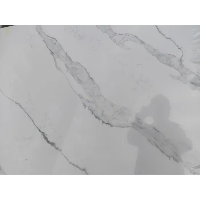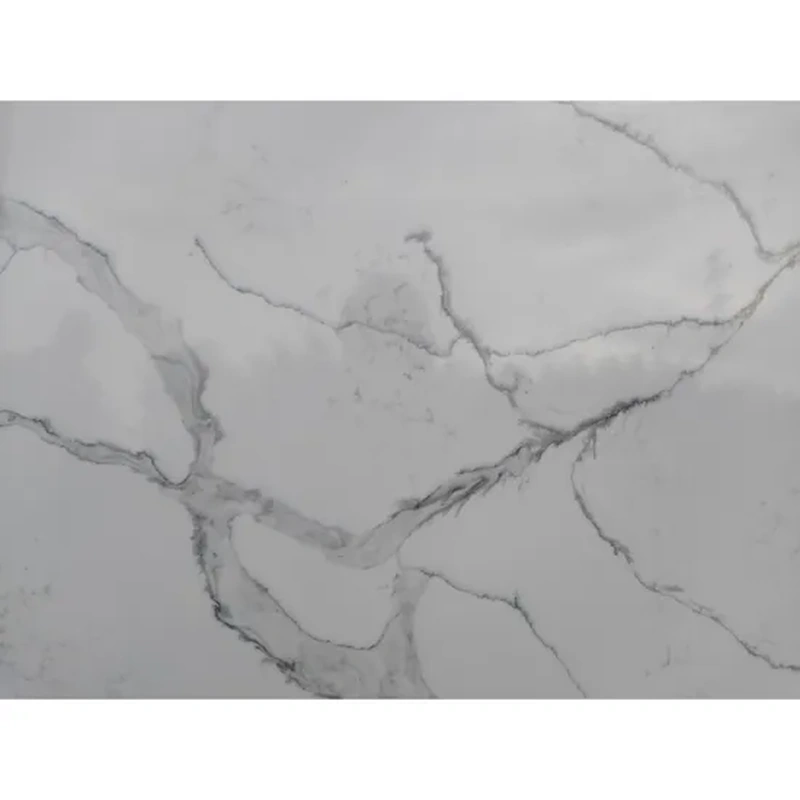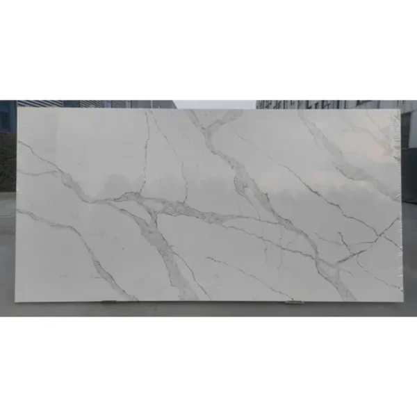 Elegant Calacatta Marble Look: This fullbody artificial stone captures the timeless elegance of natural Calacatta marble with delicate grey veining on a pristine white background, giving your space a luxurious appearance without the maintenance concerns of real marble.