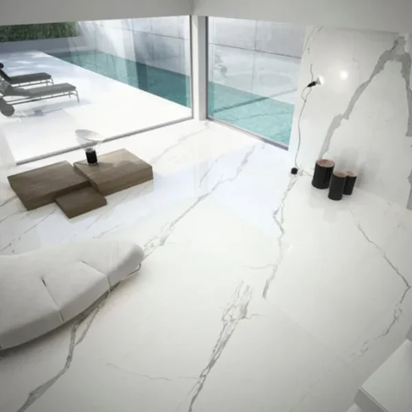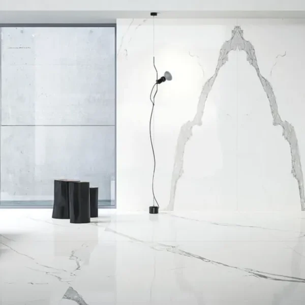 Sintered stone offers exceptional resistance to scratches, heat, stains, and UV exposure, making this polished white surface ideal for high-traffic areas and demanding applications where you need materials that maintain their beautiful appearance through years of daily use.