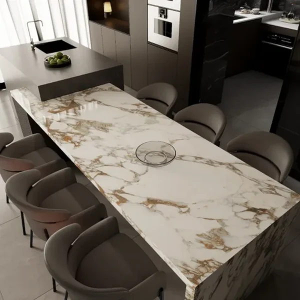 We produce these mineral-based sintered stone slabs in extra large sizes specifically designed for kitchen islands, allowing seamless installation without visible joints that can trap dirt and bacteria, creating a stunning continuous surface that elevates your kitchen aesthetics.